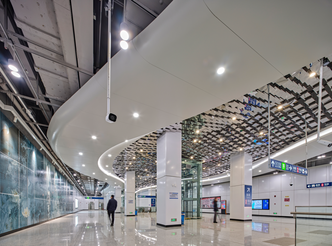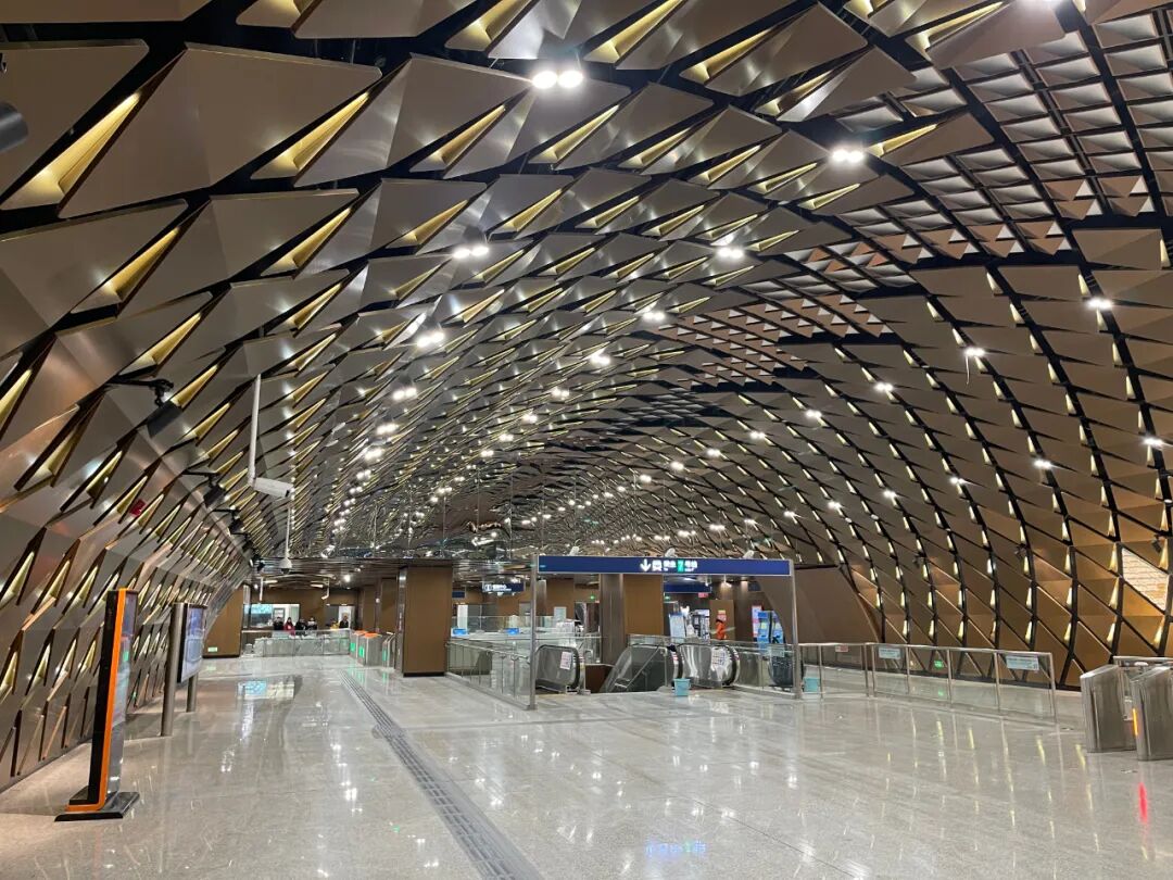 主体暗挖段隧道开挖面积约490平方米,形成了全线唯一无柱拱形车站,空间特征鲜明。清凉山车站由铜色龙鳞造型组成,巨大的拱形宛若游龙,气势磅礴。天花中心造型与灯光演绎如苍穹顿开,腾云驾雾,与墙面彩绘浮雕交相辉映,集天地之华章,演绎清凉山龙蟠雄浑,彰显王者气概,尽显古都之韵。
