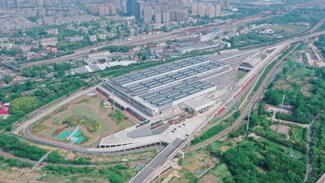 7号线马家园车辆段是国内首个轨道交通全自动驾驶高架车辆段,车辆段用地完全被铁路线合围、对外交通条件差,场坪与既有铁路线高差大、受控因素多、用地局促,因而创新性地采用架空高架车辆段方式,将大库及轨行区置于盖板上,其它生产房屋置于盖板下,有限范围内高效满足7号线全自动运行、生产、办公、生活等基本功能,极大利用土地资源,也树立了成功利用铁路受限地块的典范。
