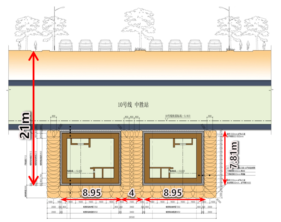 工程存在既有站未预留换乘节点、承压水头高、地质条件差、零覆土、密贴式近穿既有站等难点。设计团队创新性设计水平MJS加固+水平冻结止水帷幕加固+暗挖的复合型工法。充分结合水泥土改良土体和冻结加固理念。下穿段完成后,既有车站最终沉降变形控制在10毫米以内,成功确保既有车站运营安全,为类似工程提供了宝贵成功经验。