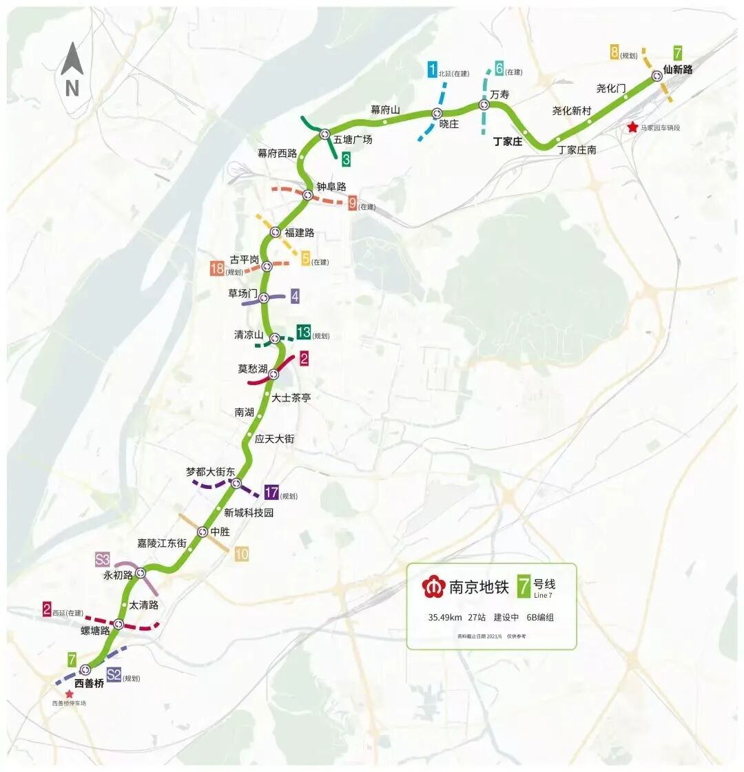 南京地铁7号线工程位于长江南岸,为东北—西南走向的大运量骨干线路,途经雨花台区、建邺区、鼓楼区和栖霞区,全长35.5公里,设站27座。车辆采用B型车,6辆编组,列车最高运行速度为80公里/时。
