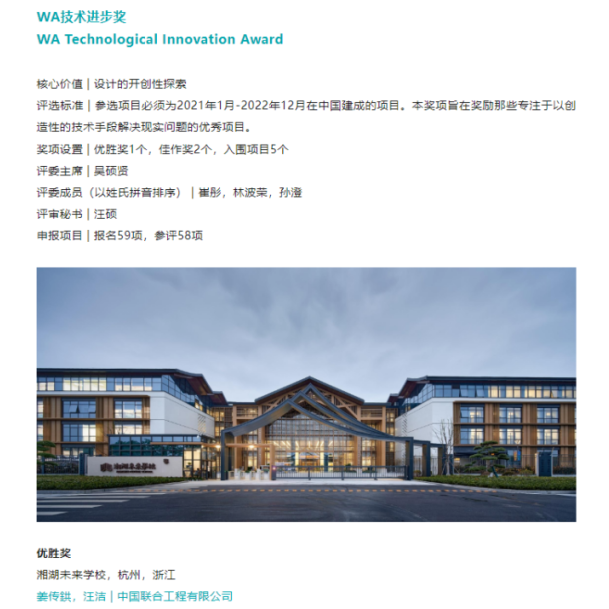 2023 WA中国建筑奖于近日公布获奖名单,中国联合工程有限公司设计的湘湖未来学校荣获技术进步优胜奖(最高奖)。