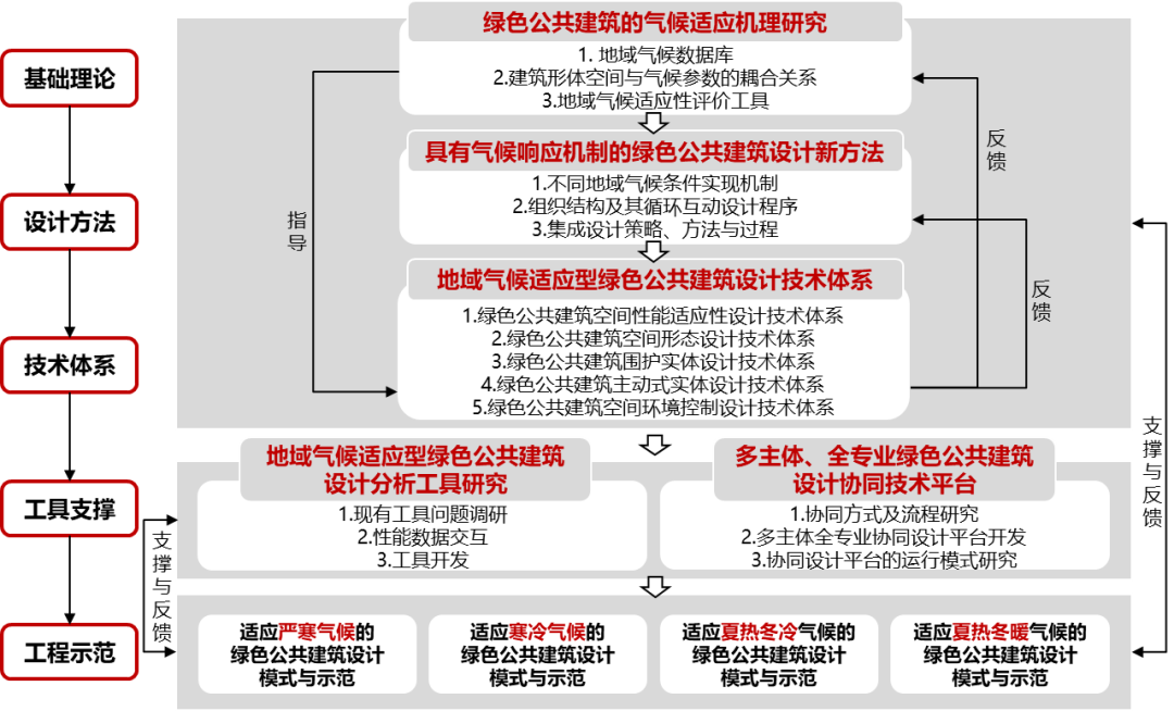 项目针对我国绿色公共建筑气候适应性机理与设计方法缺失以及绿色建筑获得感不足等问题,针对严寒、寒冷、夏热冬冷、夏热冬暖的气候区维度,东北、京津冀、长三角、珠三角的地域维度,按照“基础理论—设计方法—技术体系—工具支撑—工程示范”的递进逻辑开展,重点围绕地域气候适应型绿色公共建筑设计机理、方法与技术体系,以及辅助设计工具、协同技术平台的研发等方面开展科技攻关。创立了绿色公共建筑气候适应性设计新方法体系,构建了适应地域气候的绿色公共建筑设计技术体系,研发了多主体、全专业绿色公共建筑设计协同技术平台,形成地域气候适应型绿色公共建筑设计系列成果指导实践,并完成了地域气候适应型工程示范、集成应用与评估,为百余项工程提供技术支撑。项目的研发与推广应用塑造了外延进一步拓展、内涵进一步丰富、品质进一步提升的绿色建筑发展体系,全面推动了绿色建筑设计模式的转变与提升,为行业的转型升级和城乡建设领域可持续发展提供了有力支撑。