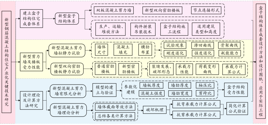 (1)建立了钢筋混凝土盒子结构住宅体系成套技术,解决了装配式剪力墙现场湿作业较多、节点质量较差、整体装配率较低等一系列难题,填补了装配式混凝土结构在该领域技术空白。(2)创新性提出了新型钢筋混凝土剪力墙(双板混凝土剪力墙),揭示了双板剪力墙受力性能和受力机理,解决了装配式盒子结构体系双板混凝土剪力墙面外稳定不足等技术难题。研发了新型双向密肋楼板,提出装配式盒子结构体系连接成套技术,揭示了该体系具有“等同现浇”的抗震性能。(3)提出了新型装配式钢筋混凝土剪力墙成套设计理论及计算方法,为新型装配式结构体系计算和应用提供了重大技术支持。