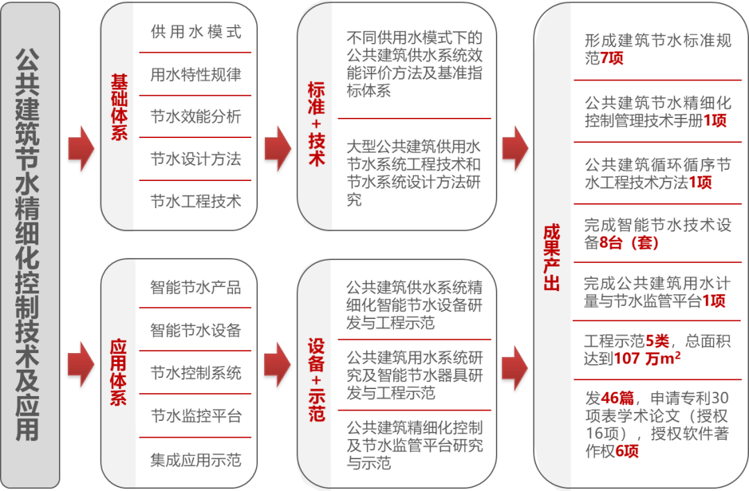 项目依托“十三五”国家重点研发计划项目,以公共建筑节水为目标,以精细化节水技术为手段,以智能化控制为依托,按照“节水技术建立与节水效能评价——节水设备与产品研发——节水监管与平台搭建”的整体技术思路,经过近五年的产学研用协同攻关,产出了涵盖节水指标体系、技术体系、标准体系、产品体系、管控体系的建筑节水领域系统性成果,形成了三项重要创新成果。